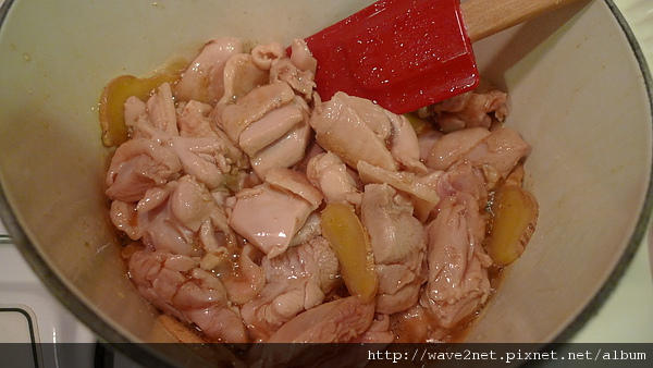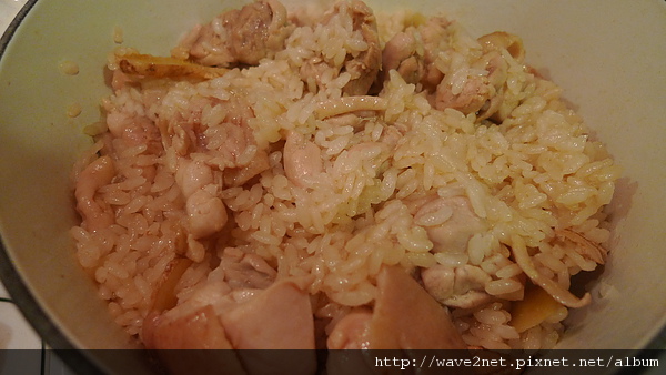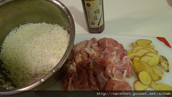 材料:白米 / 雞腿肉切丁/ 老薑切片 / 黑麻油 / 米酒 / 醬油膏