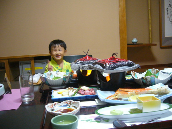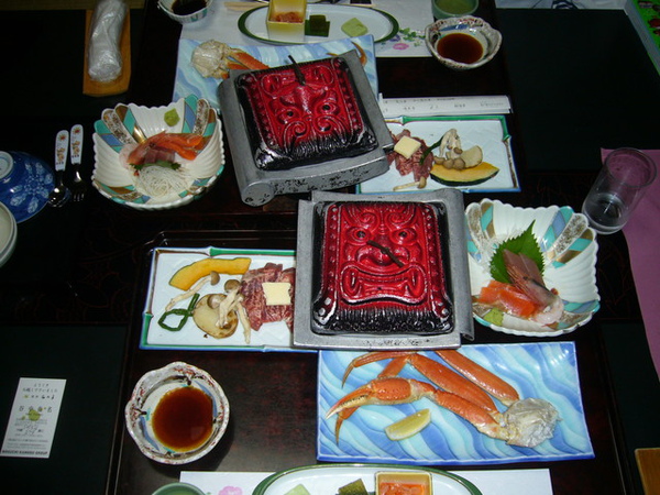 晚餐在房間用餐(還有很多菜還沒上),紅色鐵蓋圖是登別的代表物鬼像,登別有著著名的地獄谷溫泉,所以街上到處可以看到各種代表不同意義的鬼像,每年8月的最後一個星期六日,登別溫泉街會舉辦「登別地獄祭」,非常熱鬧。